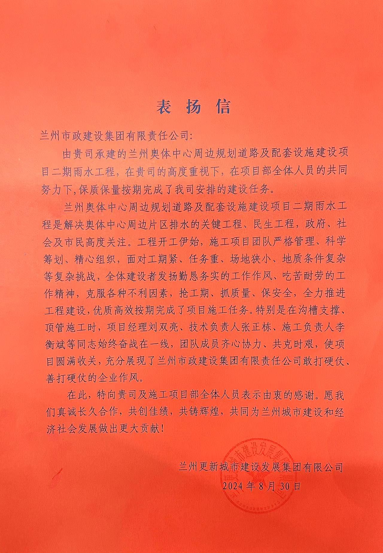近日,蘭州市政建設(shè)集團(tuán)收到業(yè)主單位蘭州更新城市建設(shè)發(fā)展集團(tuán)有限公司的一封表揚(yáng)信。對我司承建的蘭州奧體中心周邊規(guī)劃道路及配套設(shè)施建設(shè)項(xiàng)目二期雨水工程,圓滿地完成施工任務(wù),表示衷心的感謝。